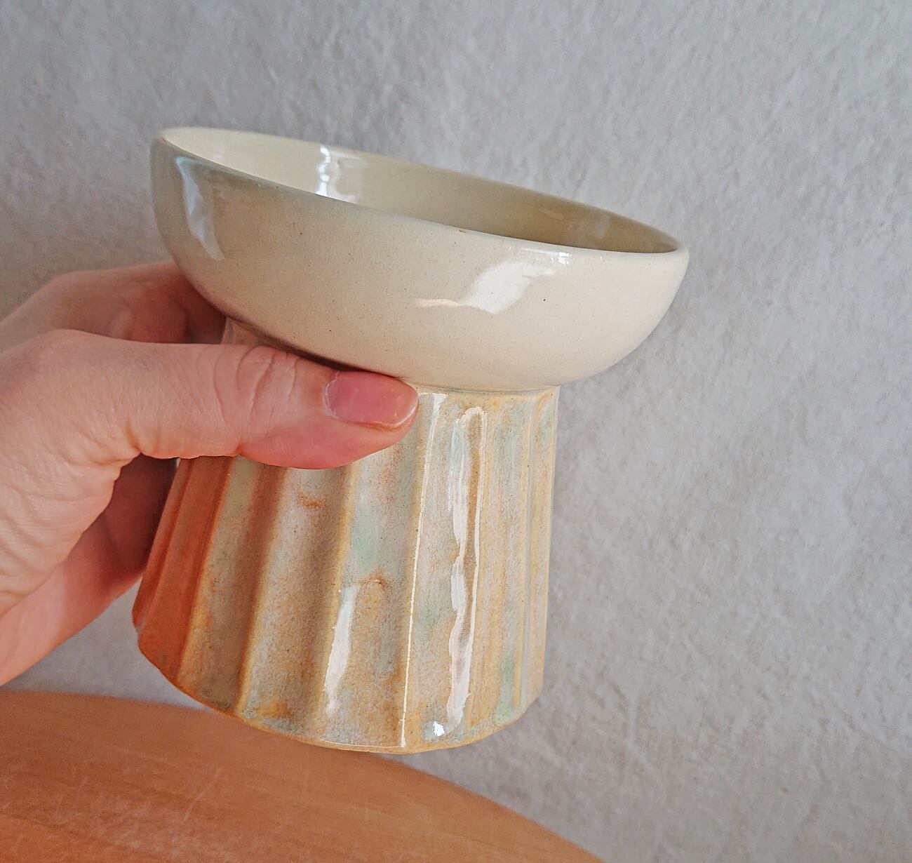 脚の部分にしのぎの削りを入れ、水色~黄色のグラデーションの出る釉薬をかけました。