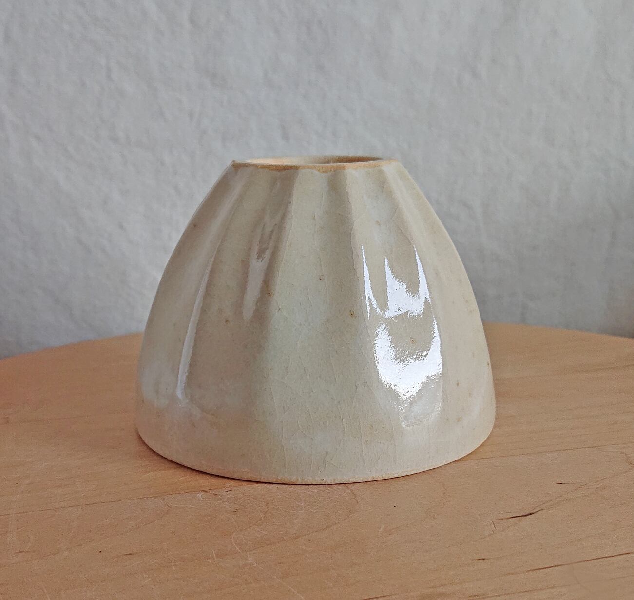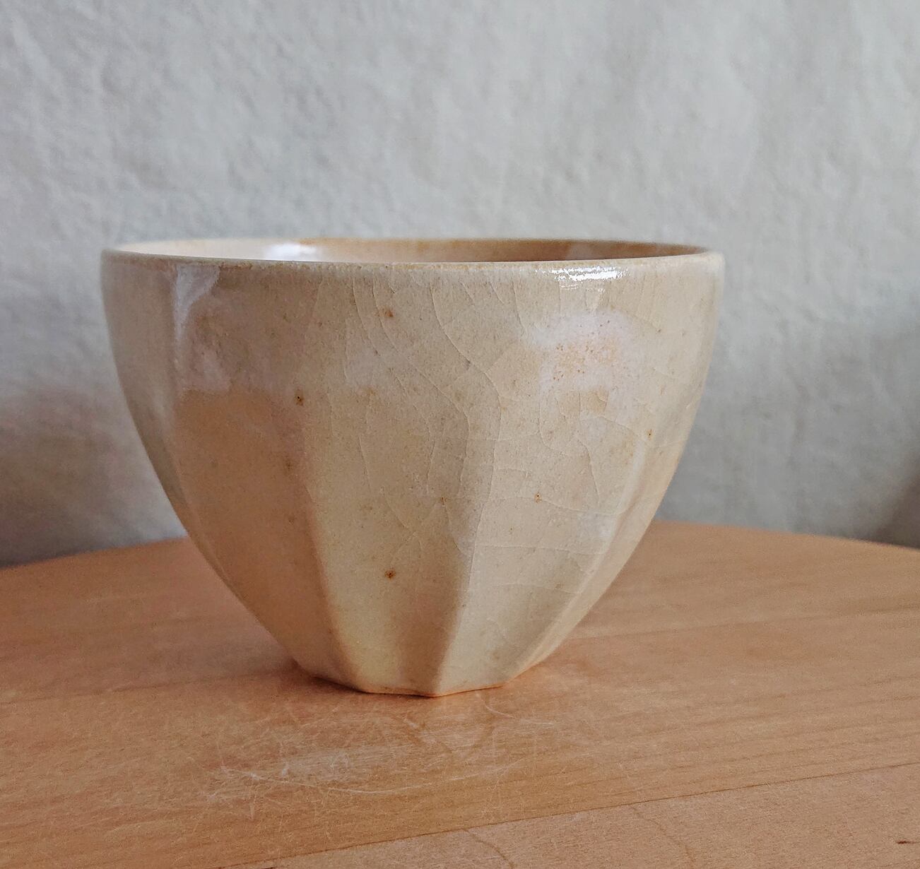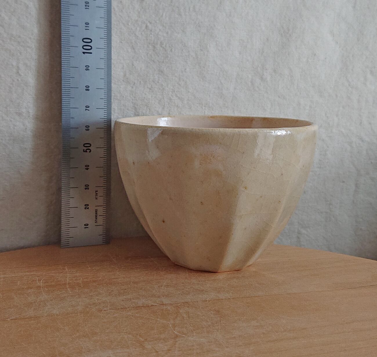 全体にクリーム色のマット系の釉薬をかけてから、外側につやのある白い釉薬をかけています。