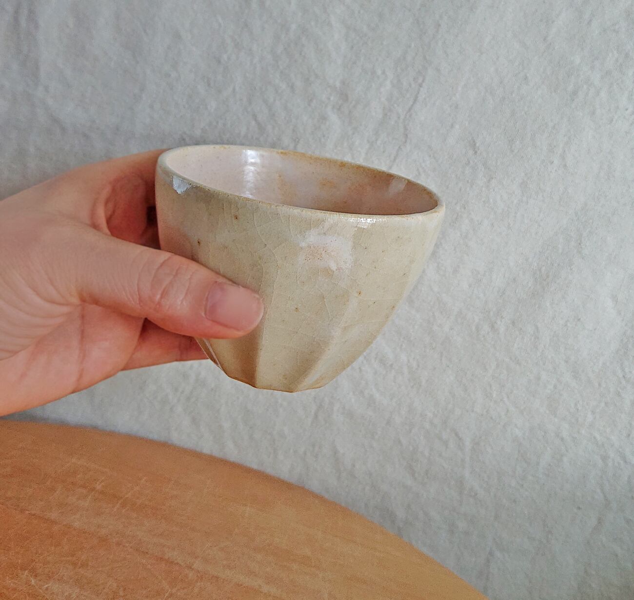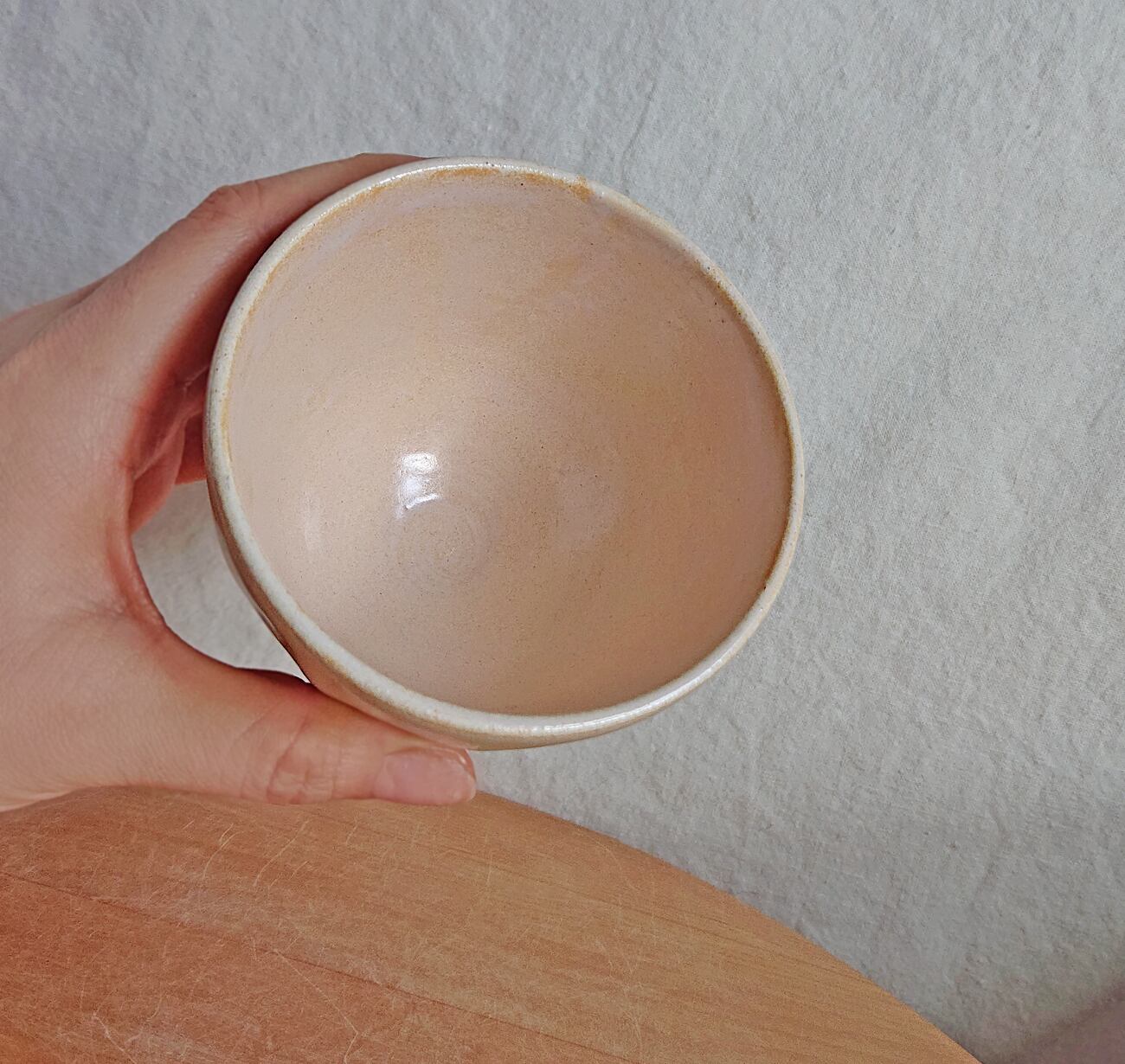 外側は風合いのあるアイボリーのガラス質で、内側は半マットなピンク色に発色しました。