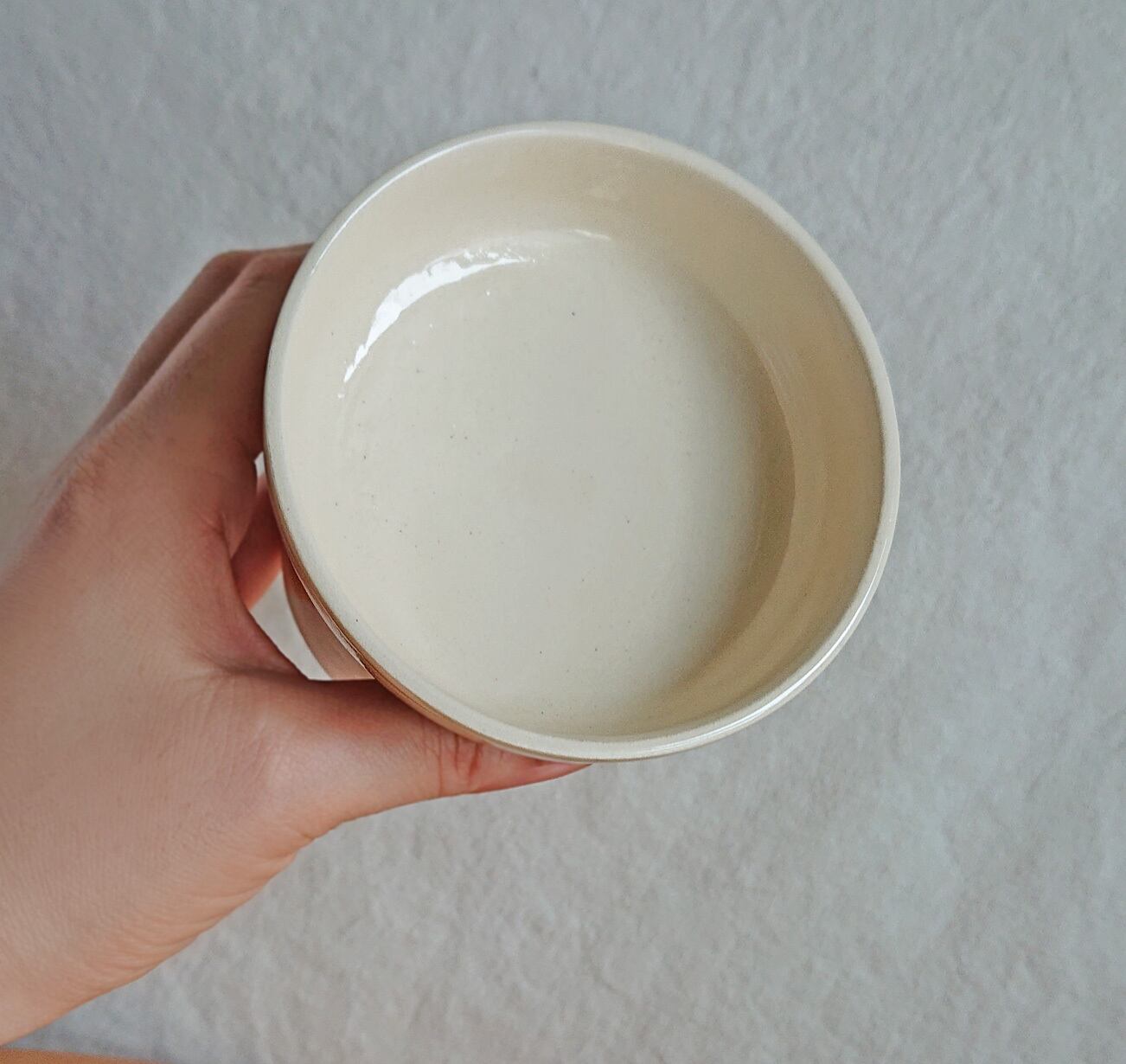 外側にはごく薄い茶色の釉薬を、お皿の内側部分には透明釉を塗っています。