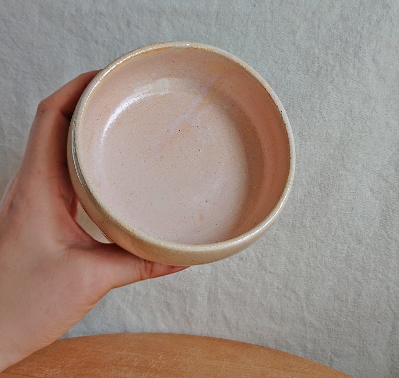 外側は風合いのあるアイボリーのガラス質で、内側は半マットなピンク色に発色しました。